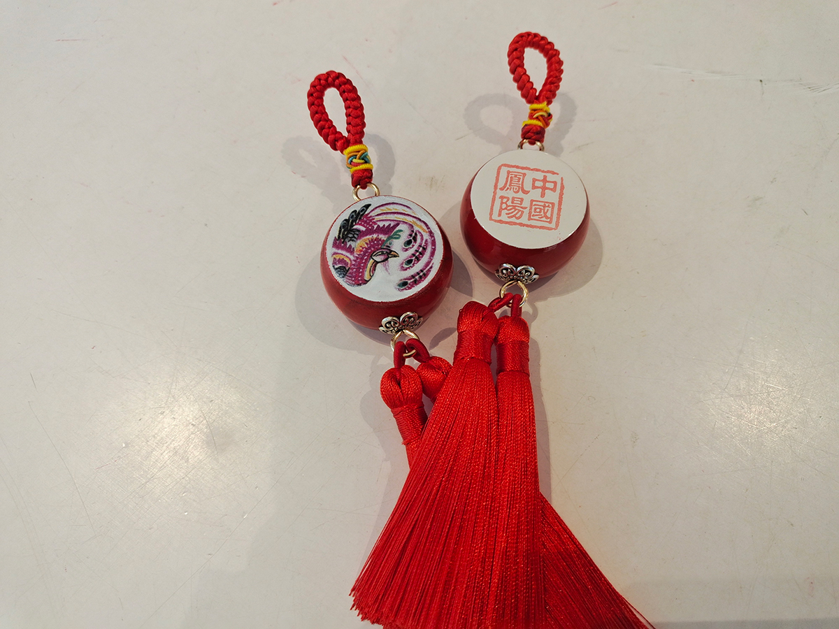 商品名称:桃木小花鼓挂件,商品类型:文创,商品单位:个,商品规格:直径3cm,商品售价:25;