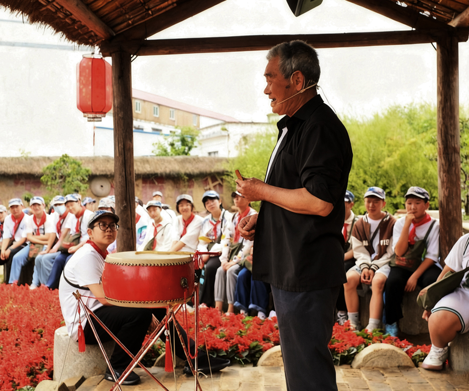 2020年 , 扎根于凤阳民间的省级非遗曲艺—— 淮河大鼓 , 正式被引入小岗村当年农家非遗传习基地,成为小岗村非遗文化展演的重要组成部分,其内容贴近生活,风趣幽默,深受孩子们的喜爱。非遗传承人何吉平,为孩子们演唱淮河大鼓,其诙谐的唱词,饱经岁月的唱腔,深受孩子们的喜爱,也让这一非遗曲艺得以传承发展。