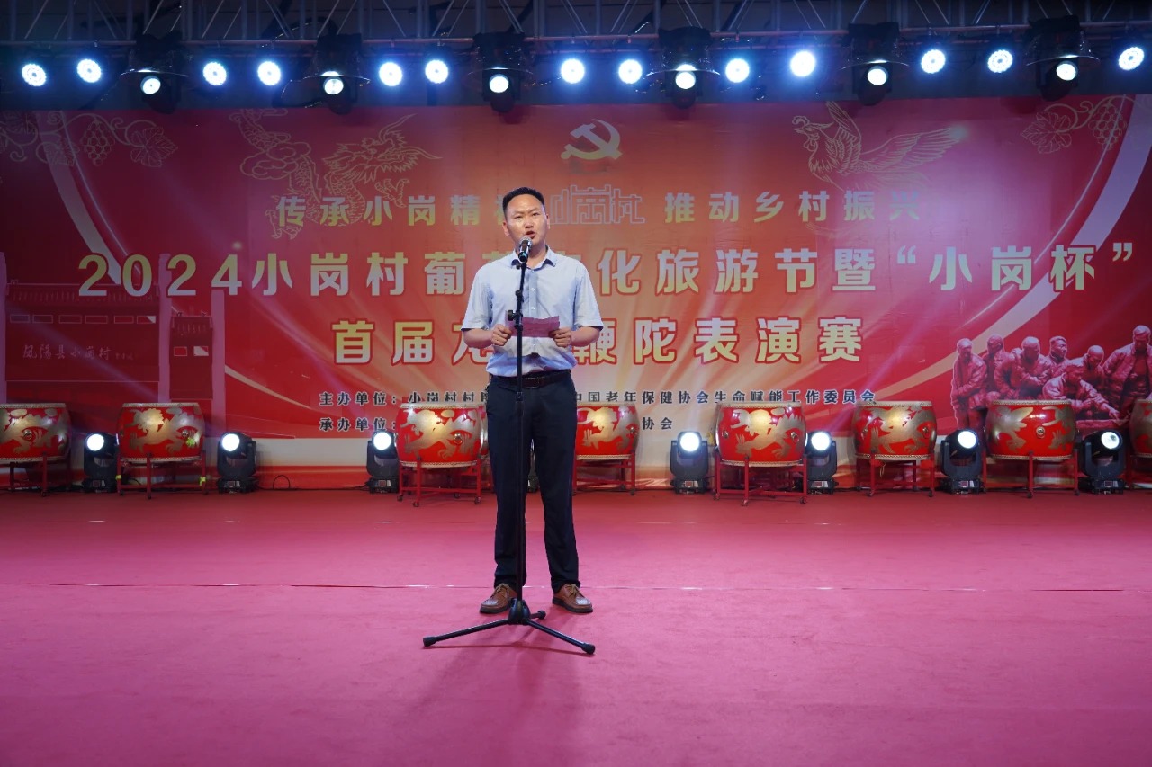 西园晚霁浮嫩凉,开尊漫摘葡萄尝。改革源头迎盛会,龙飞凤舞鞭陀忙。8月9日晚,2024年小岗村葡萄文化旅游节暨“小岗杯”首届龙凤鞭陀表演赛系列活动在小岗村开幕。中国老年人保健协会生命赋能工作委员会会长刘志远、蚌埠市老体协主席窦新会、明光市老体协主席周利修、凤阳县老体协主席王胜勤、大包干带头人,小岗村“两委”班子成员以及来自全国各地的鞭陀舞龙参赛者代表参加开幕式。