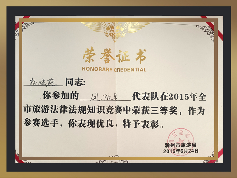 所获荣誉:凤阳县代表队在2015年全市旅游法律法规知识竞赛中荣获三等奖。